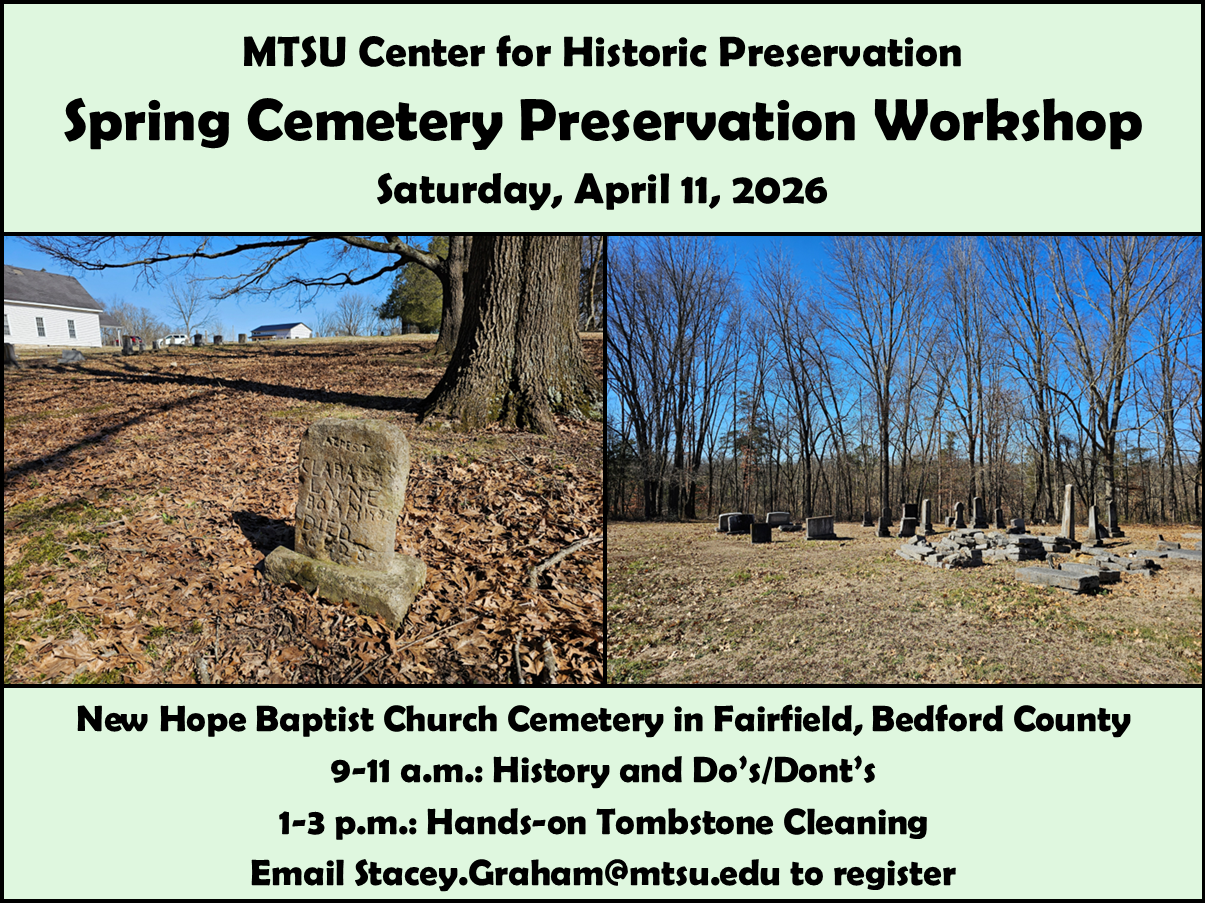 The Center for Historic Preservation works with community organizations in the Middle TN area (and potentially across the state) to present in-person workshops that combine presentations on cemetery best practices with hands-on opportunities to clean tombstones in a historic cemetery. If you’re interested in holding a workshop in your community, or in simply being added to the emailing list (to get announcements for upcoming workshops), please email stacey.graham@mtsu.edu.